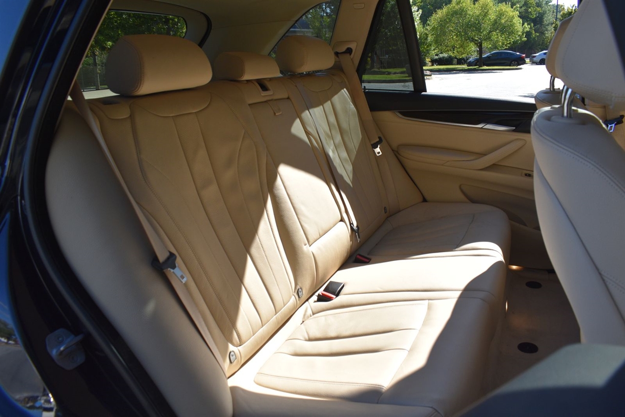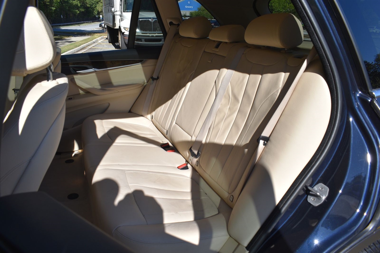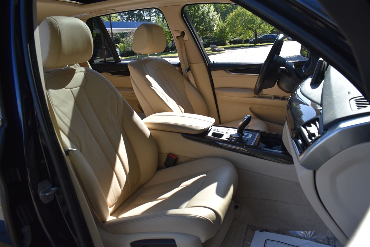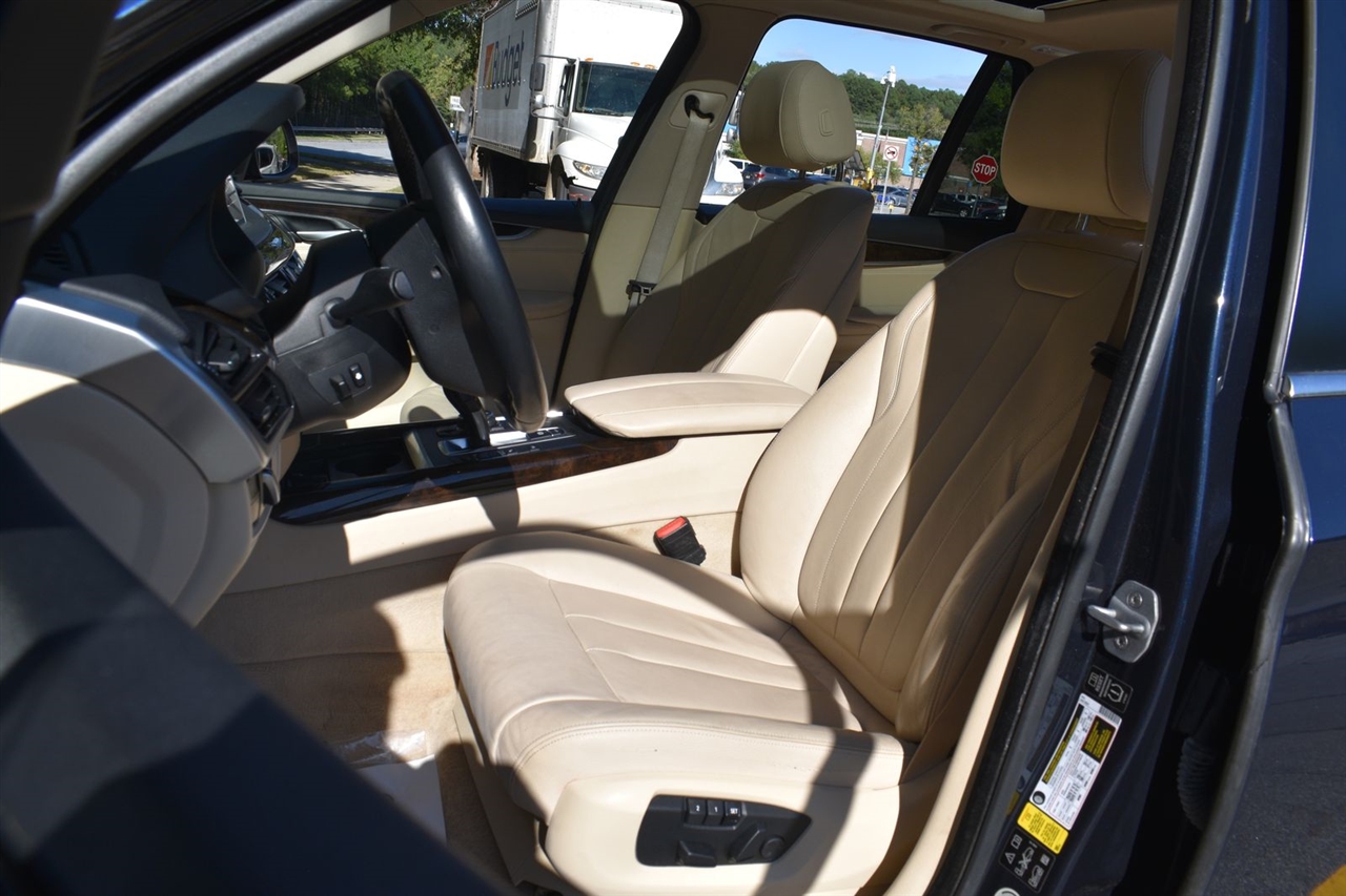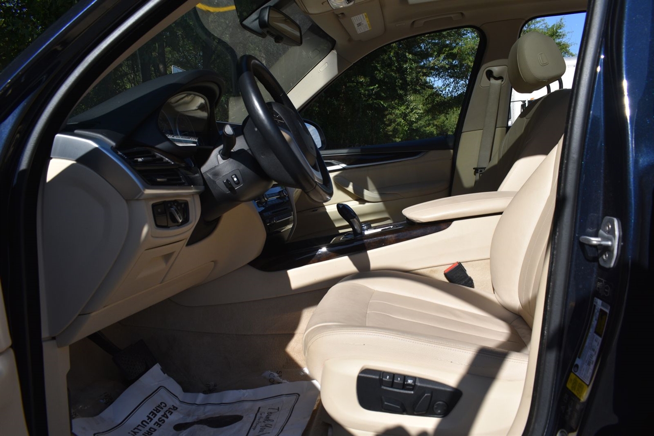Imperial Blue Metallic 2015 BMW X5 xDrive35i AWD 8-Speed Automatic 3.0L I6 DOHC 24V TwinPower Turbo Canberra Beige Leather, 10 Speakers, 3.154 Axle Ratio, 4-Wheel Disc Brakes, ABS brakes, Air Conditioning, Alloy wheels, AM/FM radio, Anti-Theft AM/FM Stereo w/CD/MP3, Anti-whiplash front head restraints, Auto tilt-away steering wheel, Auto-dimming door mirrors, Auto-dimming Rear-View mirror, Automatic temperature control, Brake assist, Bumpers: body-color, CD player, Delay-off headlights, Driver door bin, Driver vanity mirror, Dual front impact airbags, Dual front side impact airbags, Electronic Stability Control, Emergency communication system: BMW Assist eCall, Four wheel independent suspension, Front anti-roll bar, Front Bucket Seats, Front Center Armrest, Front dual zone A/C, Front fog lights, Front reading lights, Fully automatic headlights, Garage door transmitter, Genuine wood console insert, Genuine wood dashboard insert, Genuine wood door panel insert, Head restraints memory, Heated door mirrors, Heated Front Seats, Heated front seats, Heated Rear Seats, Heated Steering Wheel, Hi-Fi Sound System, High intensity discharge headlights: Bi-xenon, High-Intensity Retractable Headlight Washers, Illuminated entry, Low tire pressure warning, Lumbar Support, Memory seat, Navigation System, Navigation System w/Touchpad, Occupant sensing airbag, Outside temperature display, Overhead airbag, Overhead console, Panic alarm, Passenger door bin, Passenger vanity mirror, Poplar Wood Trim, Power adjustable front head restraints, Power door mirrors, Power driver seat, Power Front Seats w/Driver Seat Memory, Power moonroof, Power passenger seat, Power steering, Power windows, Radio data system, Rain sensing wipers, Rear anti-roll bar, Rear reading lights, Rear seat center armrest, Rear window defroster, Rear window wiper, Rear-view Camera, Remote keyless entry, Roof rack: rails only, Security system, Sensatec Leatherette Upholstery, Speed control, Speed-sensing steering, Speed-Sensitive Wipers, Split folding rear seat, Spoiler, Sport steering wheel, Steering wheel memory, Steering wheel mounted A/C controls, Steering wheel mounted audio controls, Tachometer, Telescoping steering wheel, Tilt steering wheel, Traction control, Trip computer, Turn signal indicator mirrors, Variably intermittent wipers, Weather band radio, Wheels: 18" x 8.5" Light Alloy (Style 446).