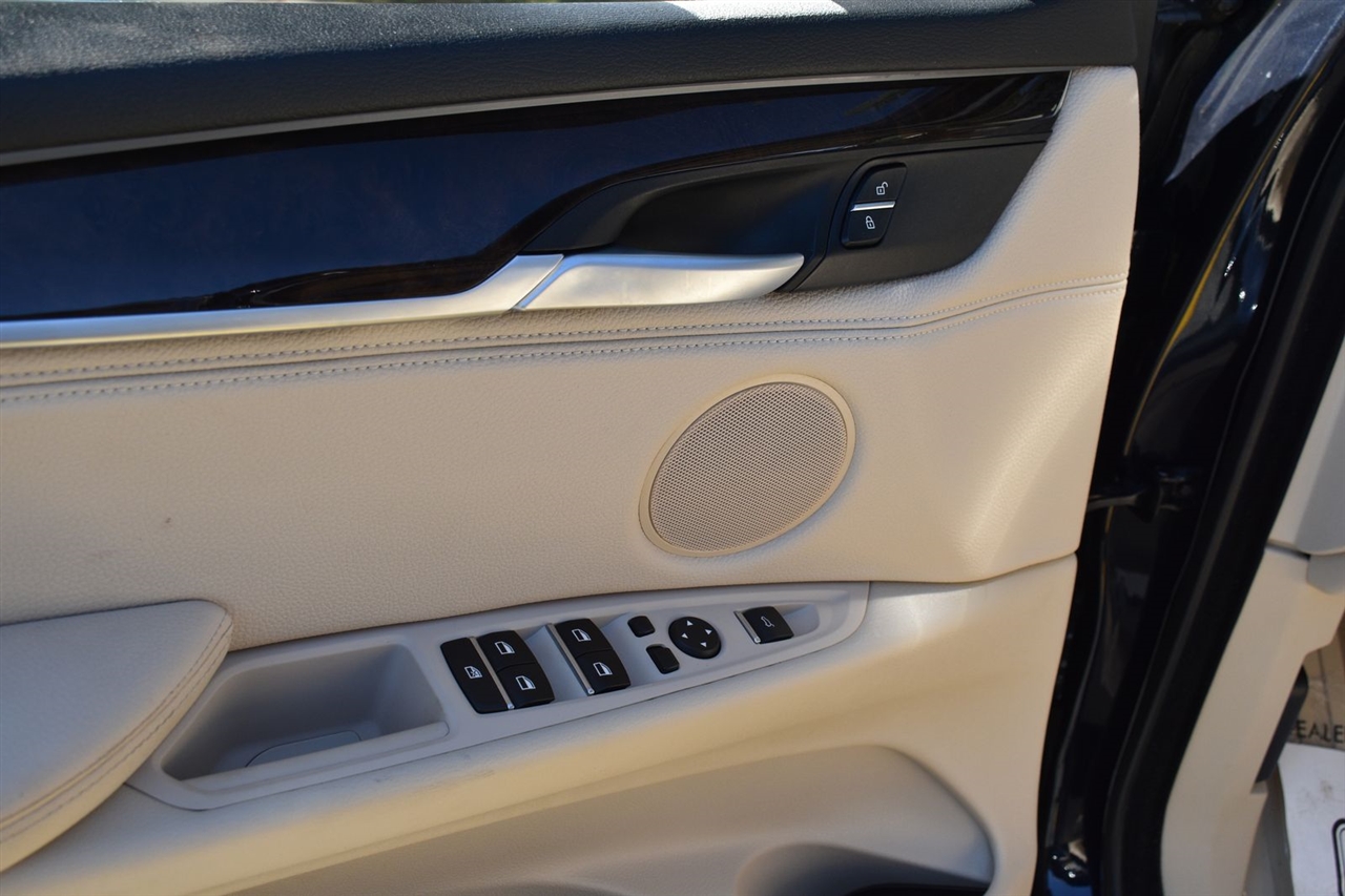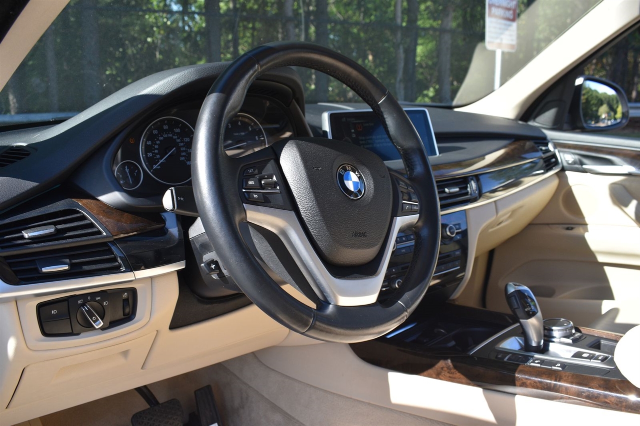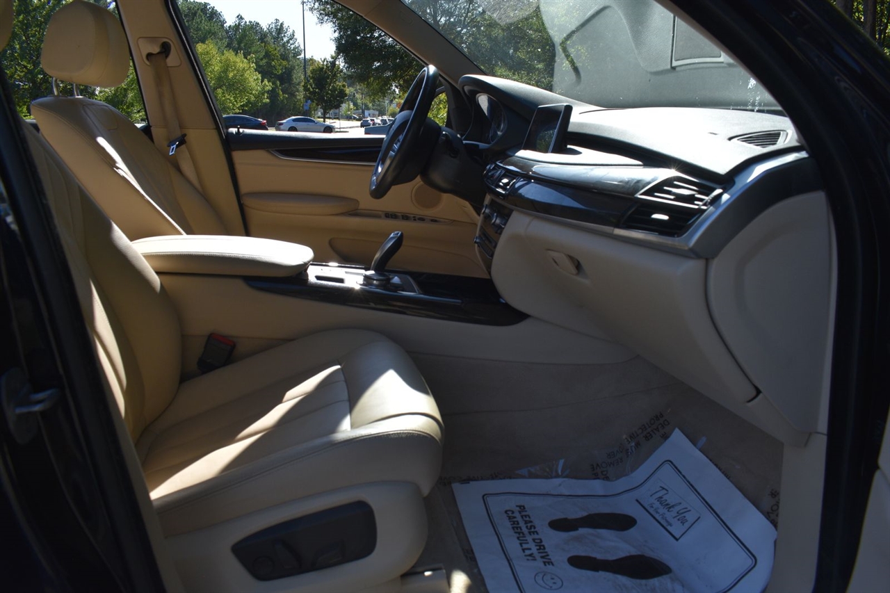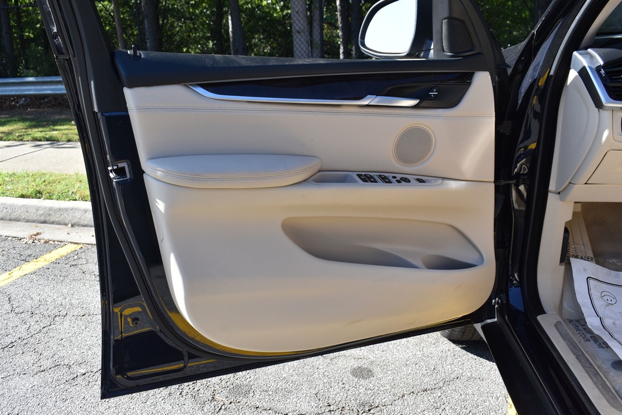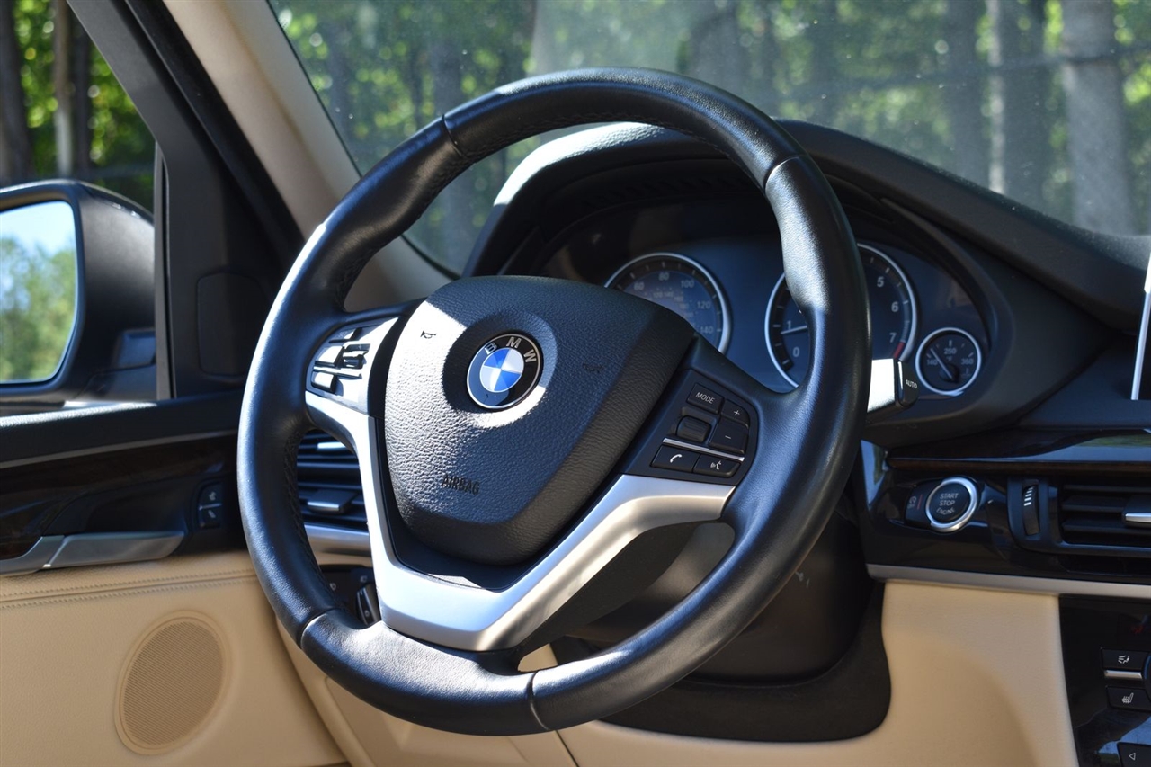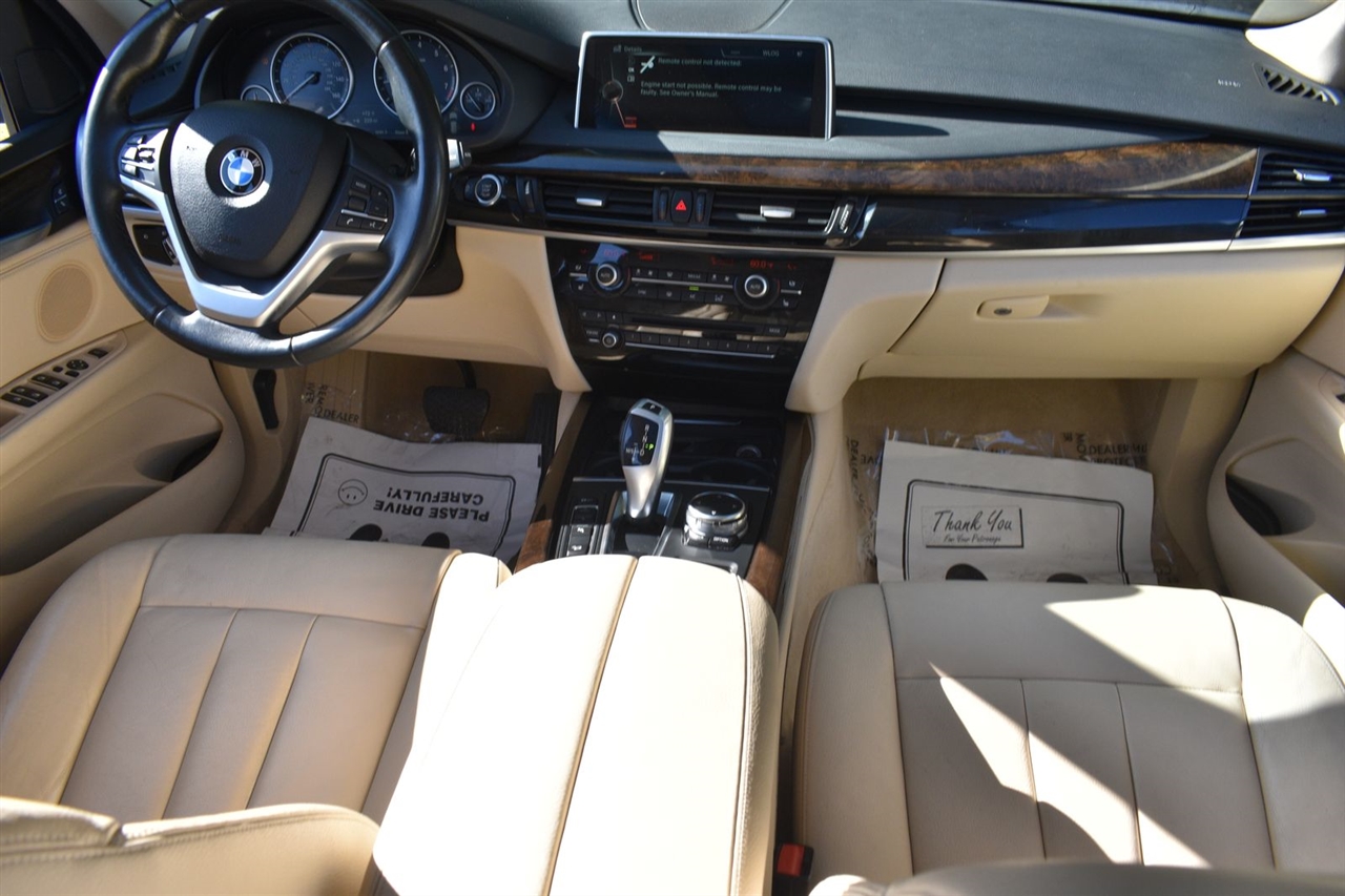 Imperial Blue Metallic 2015 BMW X5 xDrive35i AWD 8-Speed Automatic 3.0L I6 DOHC 24V TwinPower Turbo Canberra Beige Leather, 10 Speakers, 3.154 Axle Ratio, 4-Wheel Disc Brakes, ABS brakes, Air Conditioning, Alloy wheels, AM/FM radio, Anti-Theft AM/FM Stereo w/CD/MP3, Anti-whiplash front head restraints, Auto tilt-away steering wheel, Auto-dimming door mirrors, Auto-dimming Rear-View mirror, Automatic temperature control, Brake assist, Bumpers: body-color, CD player, Delay-off headlights, Driver door bin, Driver vanity mirror, Dual front impact airbags, Dual front side impact airbags, Electronic Stability Control, Emergency communication system: BMW Assist eCall, Four wheel independent suspension, Front anti-roll bar, Front Bucket Seats, Front Center Armrest, Front dual zone A/C, Front fog lights, Front reading lights, Fully automatic headlights, Garage door transmitter, Genuine wood console insert, Genuine wood dashboard insert, Genuine wood door panel insert, Head restraints memory, Heated door mirrors, Heated Front Seats, Heated front seats, Heated Rear Seats, Heated Steering Wheel, Hi-Fi Sound System, High intensity discharge headlights: Bi-xenon, High-Intensity Retractable Headlight Washers, Illuminated entry, Low tire pressure warning, Lumbar Support, Memory seat, Navigation System, Navigation System w/Touchpad, Occupant sensing airbag, Outside temperature display, Overhead airbag, Overhead console, Panic alarm, Passenger door bin, Passenger vanity mirror, Poplar Wood Trim, Power adjustable front head restraints, Power door mirrors, Power driver seat, Power Front Seats w/Driver Seat Memory, Power moonroof, Power passenger seat, Power steering, Power windows, Radio data system, Rain sensing wipers, Rear anti-roll bar, Rear reading lights, Rear seat center armrest, Rear window defroster, Rear window wiper, Rear-view Camera, Remote keyless entry, Roof rack: rails only, Security system, Sensatec Leatherette Upholstery, Speed control, Speed-sensing steering, Speed-Sensitive Wipers, Split folding rear seat, Spoiler, Sport steering wheel, Steering wheel memory, Steering wheel mounted A/C controls, Steering wheel mounted audio controls, Tachometer, Telescoping steering wheel, Tilt steering wheel, Traction control, Trip computer, Turn signal indicator mirrors, Variably intermittent wipers, Weather band radio, Wheels: 18" x 8.5" Light Alloy (Style 446).