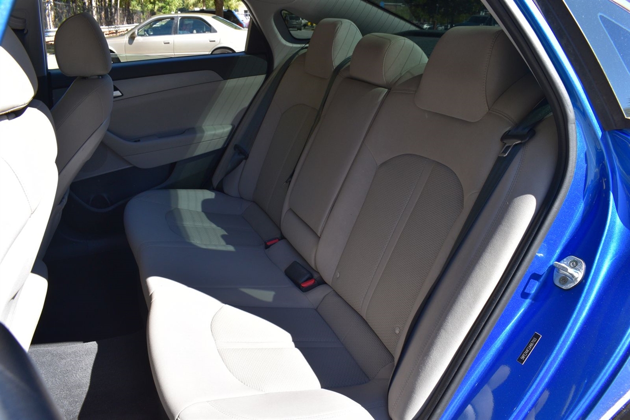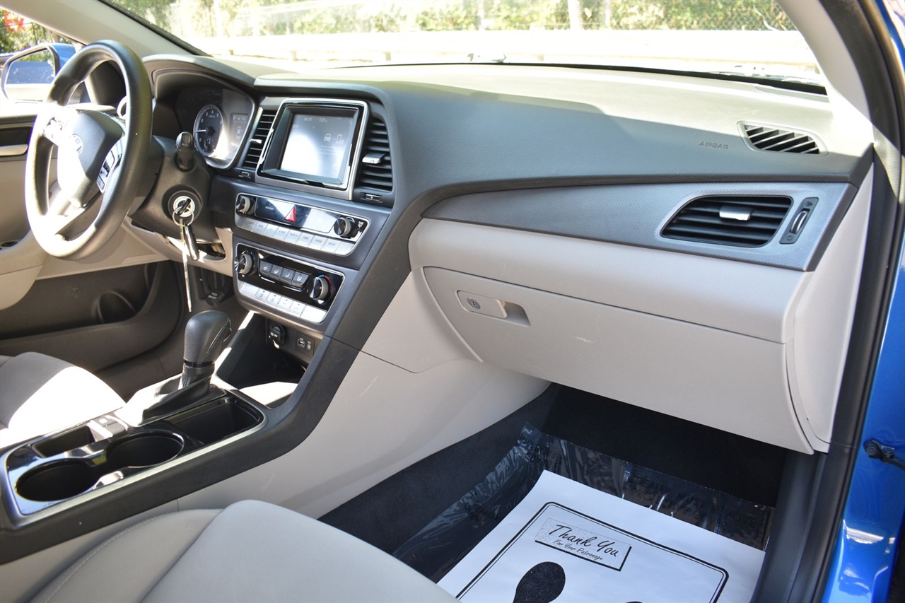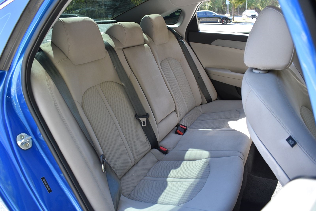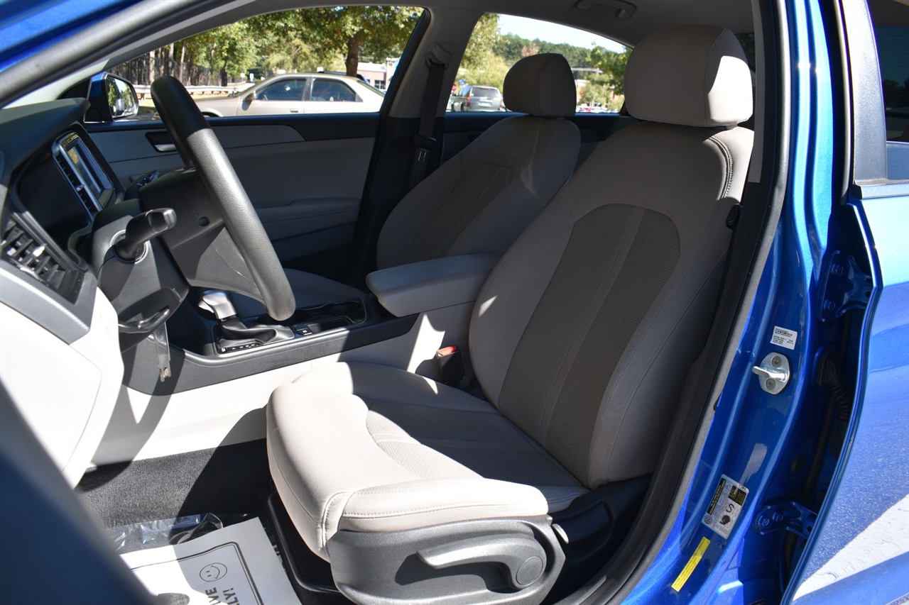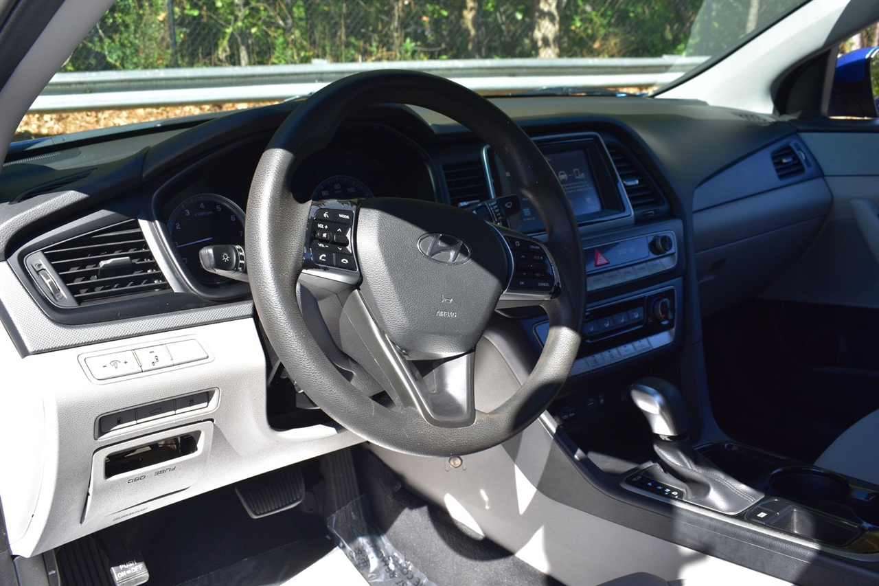Electric Blue 2018 Hyundai Sonata SE FWD 6-Speed Automatic with Shiftronic 2.4L I4 DGI DOHC 16V LEV3-ULEV70 185hp Gray Cloth, 16 x 6.5J Aluminum Alloy Wheels, 4-Wheel Disc Brakes, 6 Speakers, ABS brakes, Air Conditioning, Alloy wheels, AM/FM radio, Apple CarPlay & Android Auto, Brake assist, Bumpers: body-color, Cargo Net, Carpeted Floor Mats, Delay-off headlights, Driver door bin, Driver vanity mirror, Dual front impact airbags, Dual front side impact airbags, Electronic Stability Control, Exterior Parking Camera Rear, First Aid Kit, Four wheel independent suspension, Front anti-roll bar, Front Bucket Seats, Front Center Armrest, Front reading lights, Fully automatic headlights, Illuminated entry, Knee airbag, Low tire pressure warning, Occupant sensing airbag, Option Group 01, Outside temperature display, Overhead airbag, Overhead console, Panic alarm, Passenger door bin, Passenger vanity mirror, Power door mirrors, Power steering, Power windows, Radio data system, Radio: AM/FM/MP3 Display Audio, Rear anti-roll bar, Rear Bumper Applique, Rear seat center armrest, Rear window defroster, Remote keyless entry, Security system, Speed control, Speed-sensing steering, Speed-Sensitive Wipers, Split folding rear seat, Steering wheel mounted audio controls, Tachometer, Telescoping steering wheel, Tilt steering wheel, Traction control, Trip computer, Variably intermittent wipers, YES Essentials Premium Cloth Seating Surfaces.
