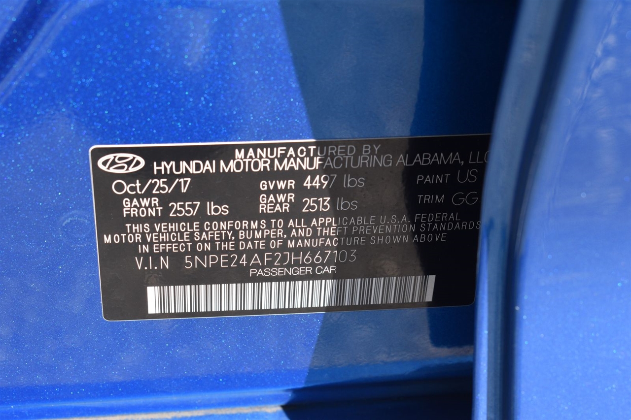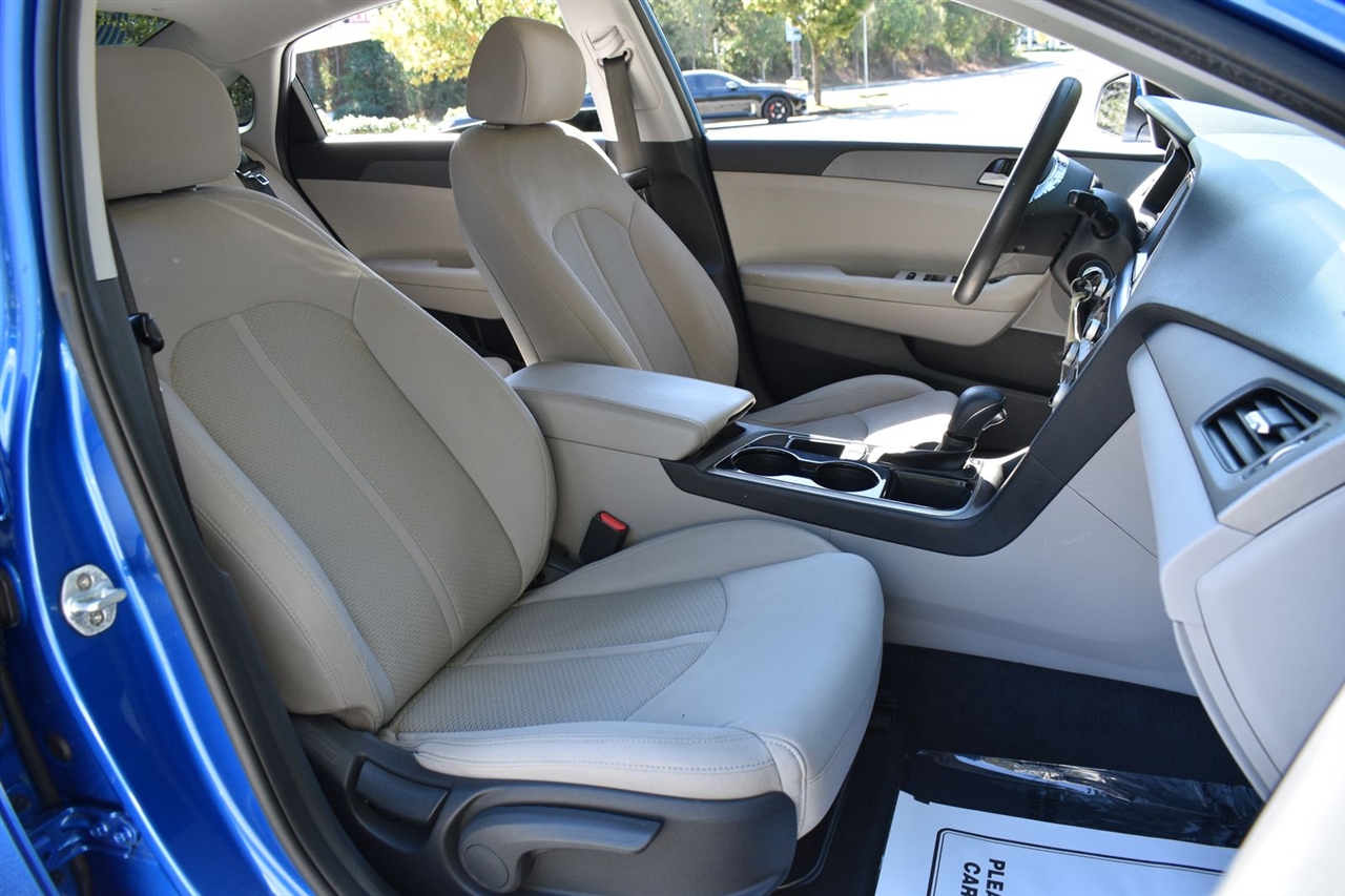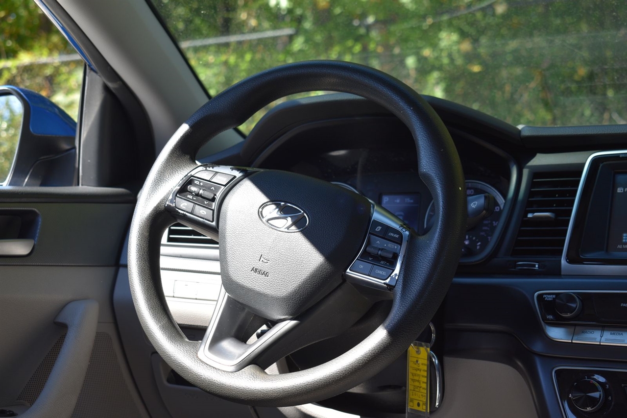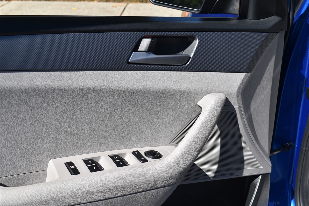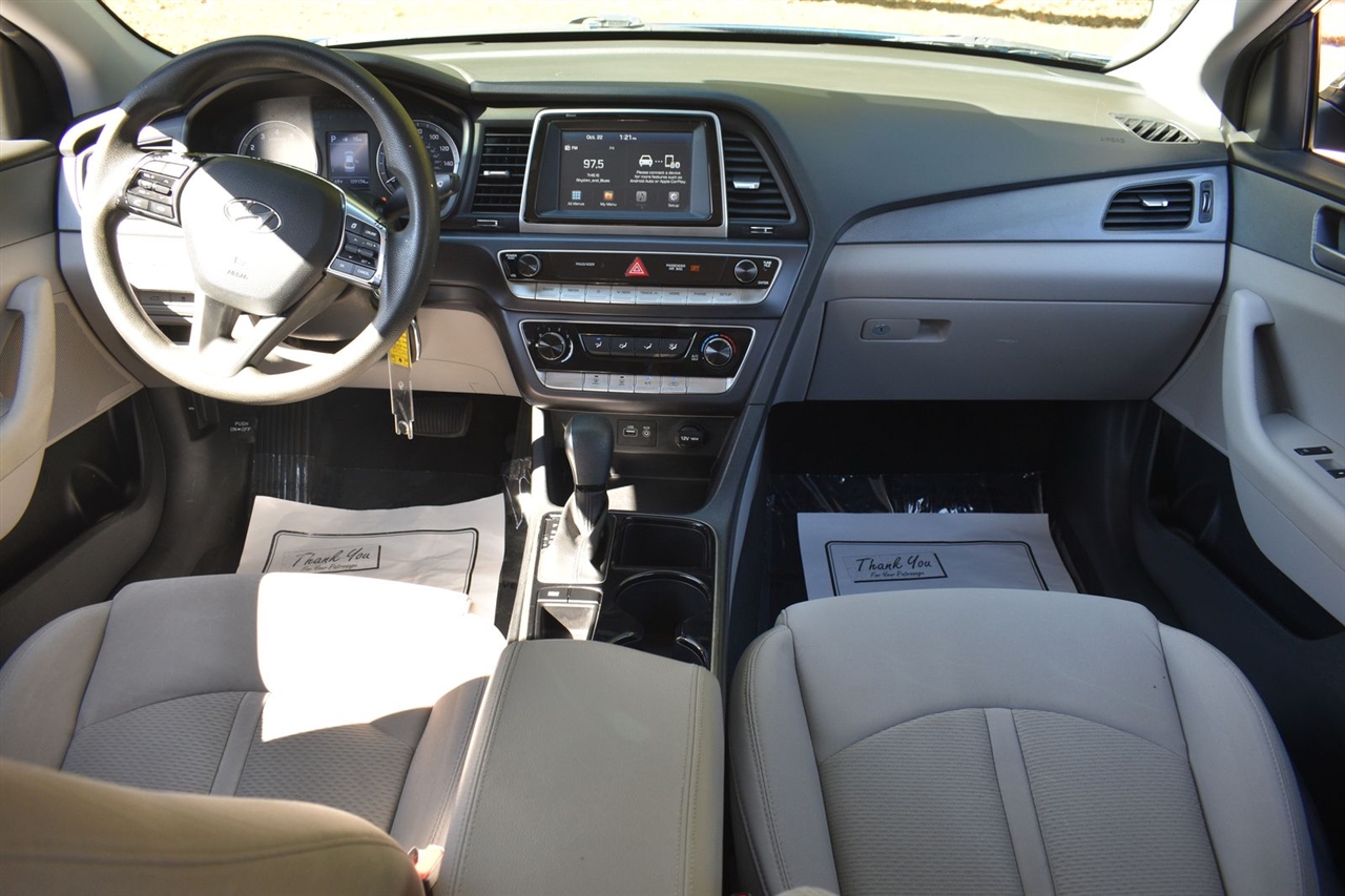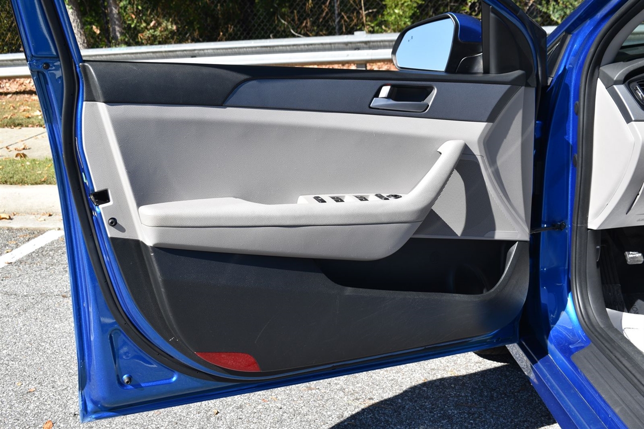 Electric Blue 2018 Hyundai Sonata SE FWD 6-Speed Automatic with Shiftronic 2.4L I4 DGI DOHC 16V LEV3-ULEV70 185hp Gray Cloth, 16 x 6.5J Aluminum Alloy Wheels, 4-Wheel Disc Brakes, 6 Speakers, ABS brakes, Air Conditioning, Alloy wheels, AM/FM radio, Apple CarPlay & Android Auto, Brake assist, Bumpers: body-color, Cargo Net, Carpeted Floor Mats, Delay-off headlights, Driver door bin, Driver vanity mirror, Dual front impact airbags, Dual front side impact airbags, Electronic Stability Control, Exterior Parking Camera Rear, First Aid Kit, Four wheel independent suspension, Front anti-roll bar, Front Bucket Seats, Front Center Armrest, Front reading lights, Fully automatic headlights, Illuminated entry, Knee airbag, Low tire pressure warning, Occupant sensing airbag, Option Group 01, Outside temperature display, Overhead airbag, Overhead console, Panic alarm, Passenger door bin, Passenger vanity mirror, Power door mirrors, Power steering, Power windows, Radio data system, Radio: AM/FM/MP3 Display Audio, Rear anti-roll bar, Rear Bumper Applique, Rear seat center armrest, Rear window defroster, Remote keyless entry, Security system, Speed control, Speed-sensing steering, Speed-Sensitive Wipers, Split folding rear seat, Steering wheel mounted audio controls, Tachometer, Telescoping steering wheel, Tilt steering wheel, Traction control, Trip computer, Variably intermittent wipers, YES Essentials Premium Cloth Seating Surfaces.